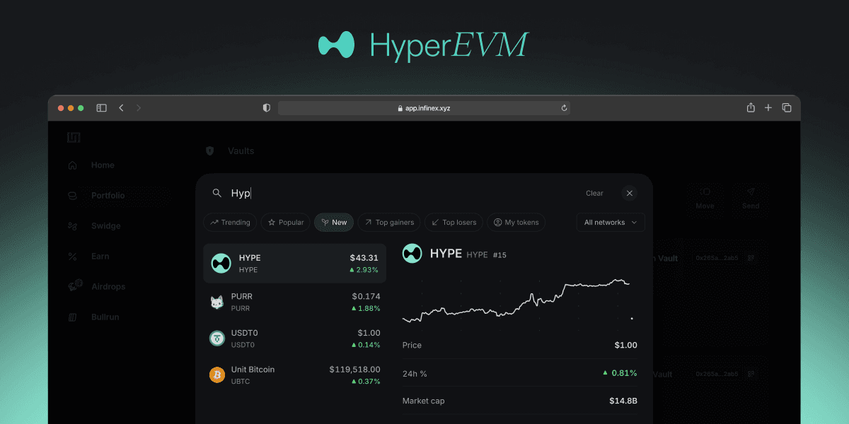 You can now deposit, send, and swidge assets on Hyperliquid’s HyperEVM. These include HYPE, LSTs (kHYPE), and Unit tokens (UBTC, UETH, USOL). Use the Explorer to search any token by name or paste in a contract address. See live prices, token details, and filter by chain to browse HyperEVM.