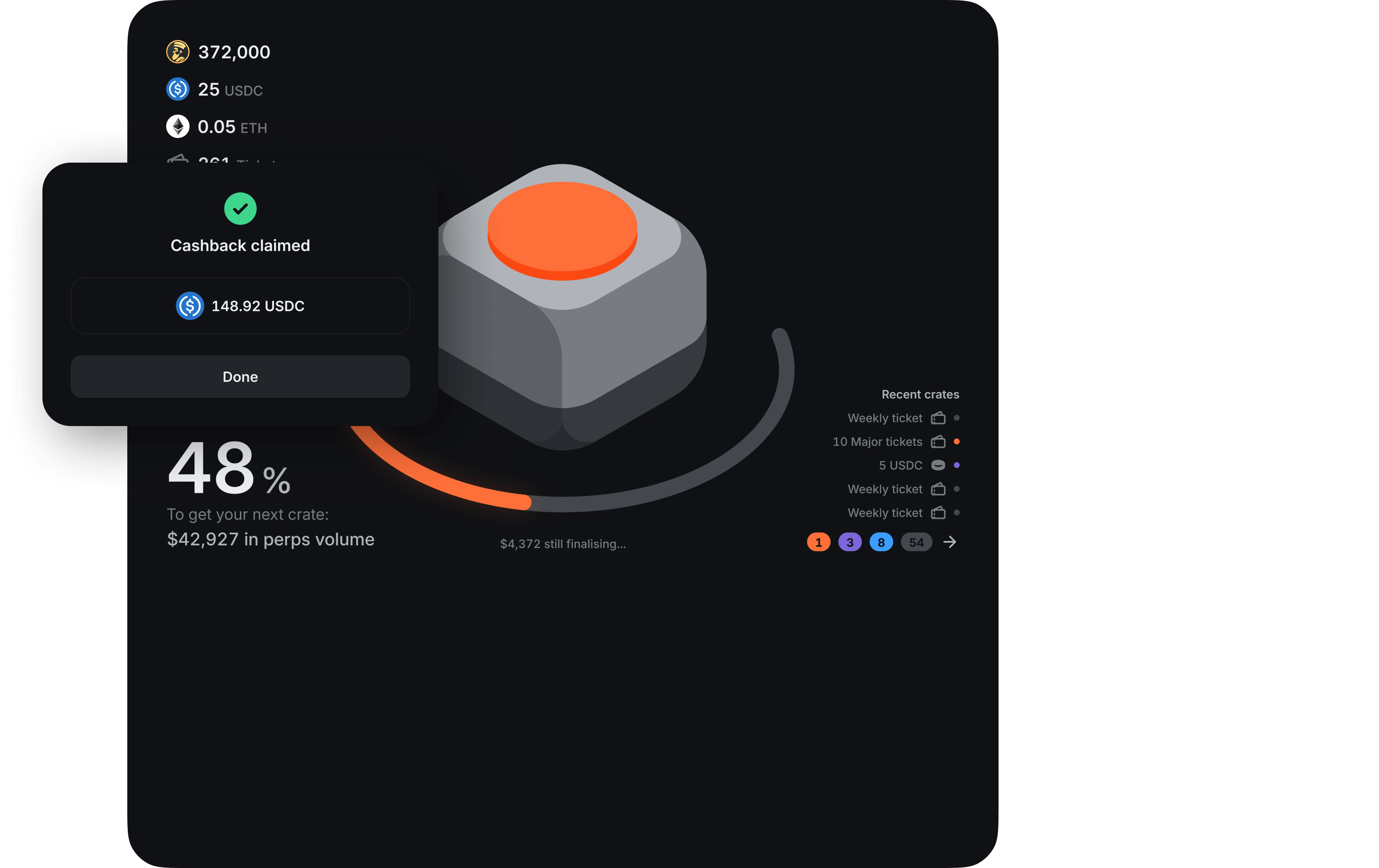 Certain Digital Asset incentives may be made available to you by Infinex and/or third parties on behalf of Infinex in exchange for completing certain activities on or through the Services, like performing a certain number of transactions, transferring Digital Assets through the Interface, or by interacting with certain smart contracts made available through the Services (collectively, "Rewards").