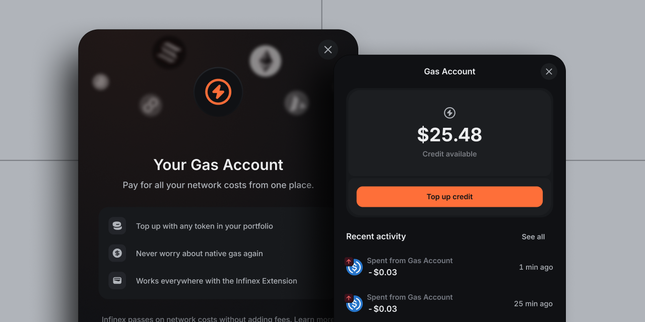With the addition of multi-wallet support and the Infinex Extension, we're rolling out an integrated gas account for all users. The gas account serves as the one place for paying for all network costs and works in-app and in-extension, on all supported chains.