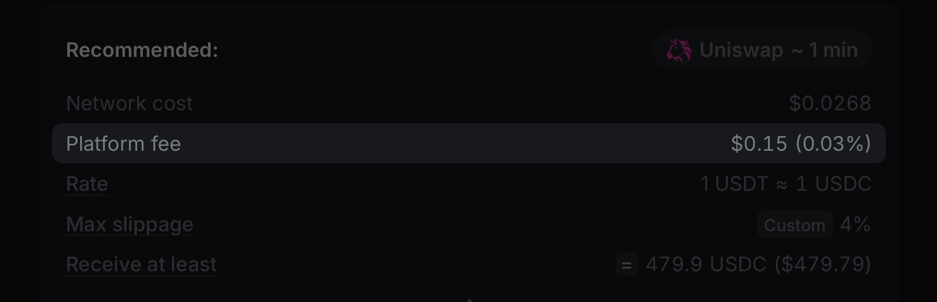 - 0.03% — same-chain stable swap (e.g. USDC on Ethereum → USDT on Ethereum)