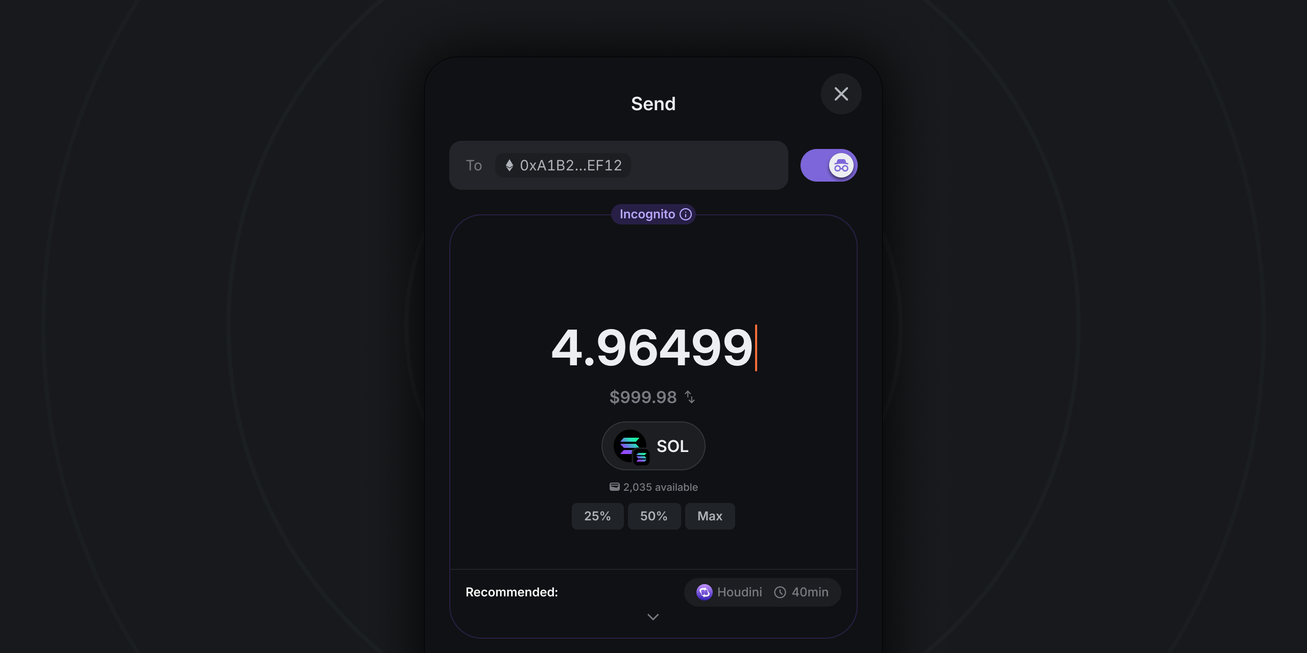 You can now send assets with enhanced privacy using Incognito Mode – a privacy-focused swap-and-send feature that breaks the direct on-chain link between sender and recipient wallets.